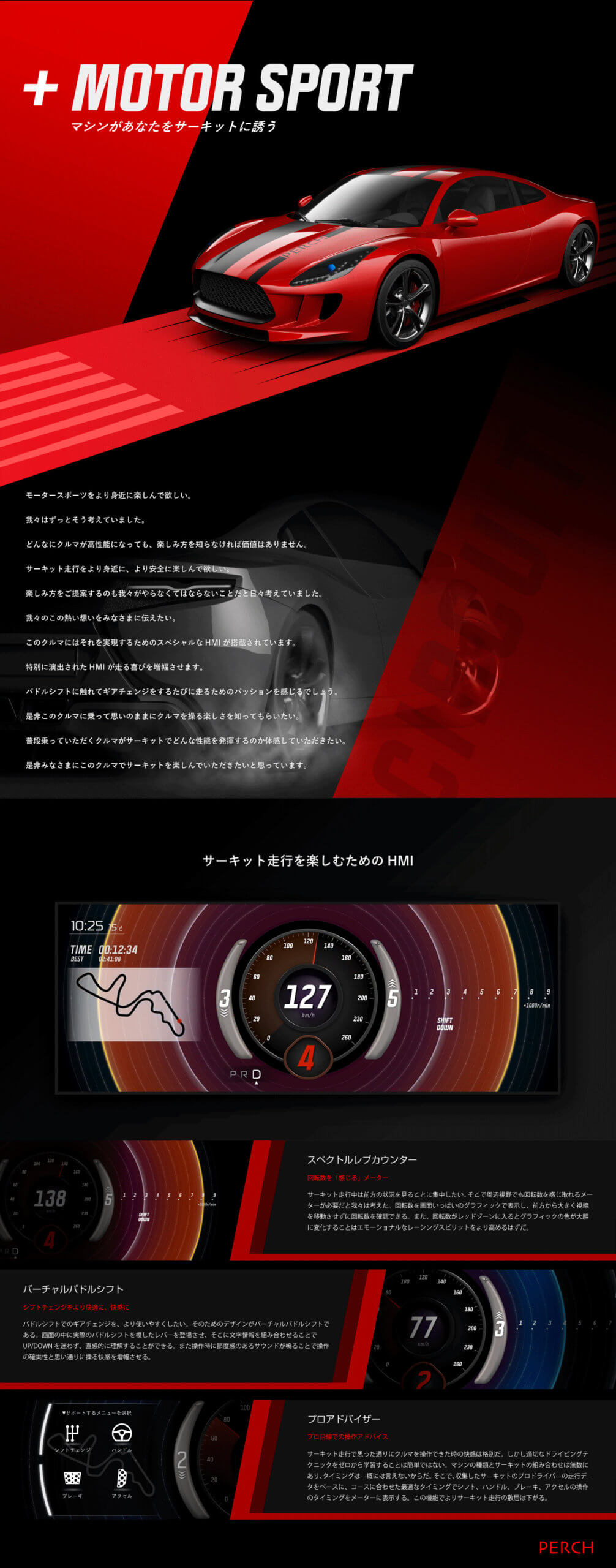 PERCH社内にてHMI研究の一環としてサーキット走行専用のHMIデザインを行い、それを多くの方にみていただくためのプロモーションをとして「見せ方」をデザインスタディしました。