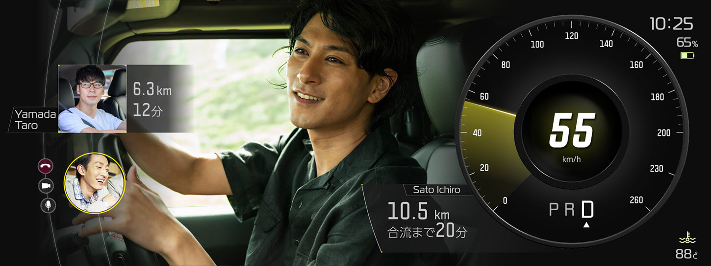 ドライブ中に友人からの通話が入ると大画面のリアルタイム動画でコミュニケーションが始まります。運転のための機能と両立しつつも、友人の表情が大きく見えるレイアウトにしたことで気持ちがよりつながりやすくなりました。